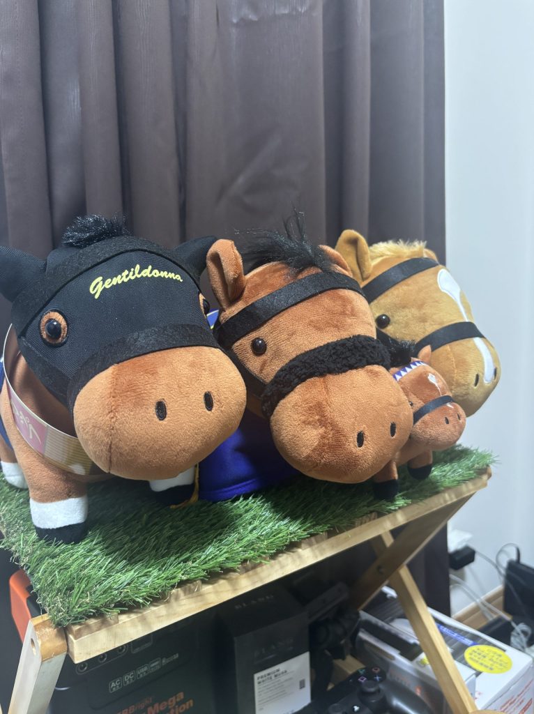 というのもたまたま寄った時に見つけたのが過去の名馬たちのぬいぐるみを見たとき、どうしても欲しくなってしまいまして…